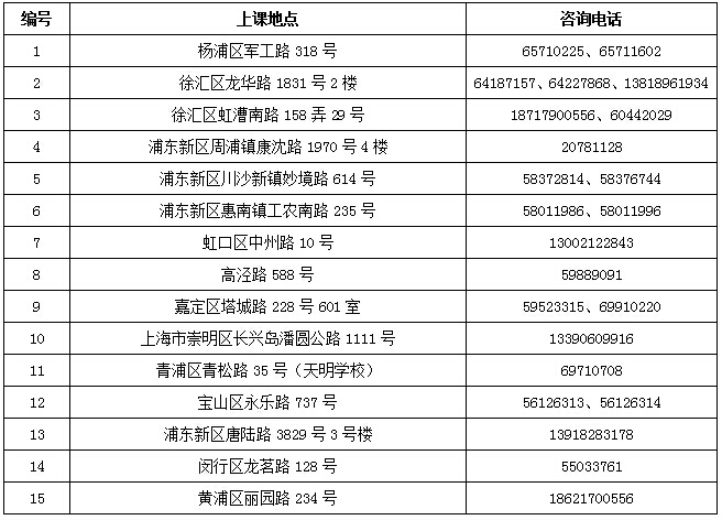 7、上课地点一览表: