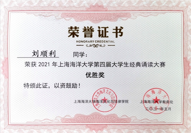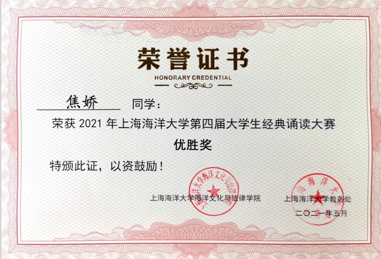 2021年5月18日下午,美加墨世界杯官方网站第四届大学生经典诵读大赛(决赛)在临港校区2404教室隆重进行。美加墨世界杯官方网站刘顺利、焦娇两位同学参加了决赛,首次获得大赛优胜奖。