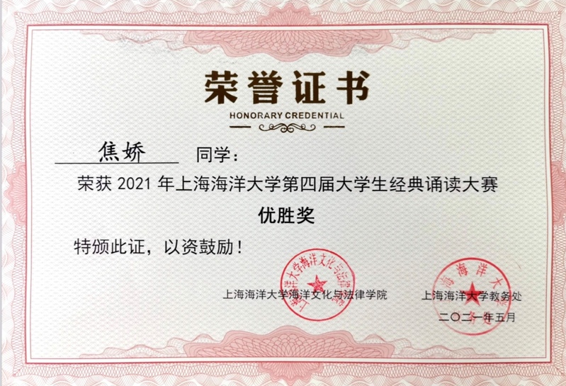 2021年5月18日下午,美加墨世界杯官方网站第四届大学生经典诵读大赛(决赛)在临港校区2404教室隆重进行。美加墨世界杯官方网站刘顺利、焦娇两位同学参加了决赛,首次获得大赛优胜奖。