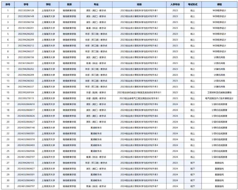 根据《美加墨世界杯官方网站学生管理服务手册》(2022版)第四章第十八条:一门课程累计缺课达到三分之一以上,或擅自缺考,或考试作弊者,该课程成绩以零分记载,不得参加补考,该课程必须重修的规定要求,经学历部在考试周周三13:00的截止日后核查学生的学习情况,共有31门次课程将取消该学生该门课程的考试资格(见下表)。